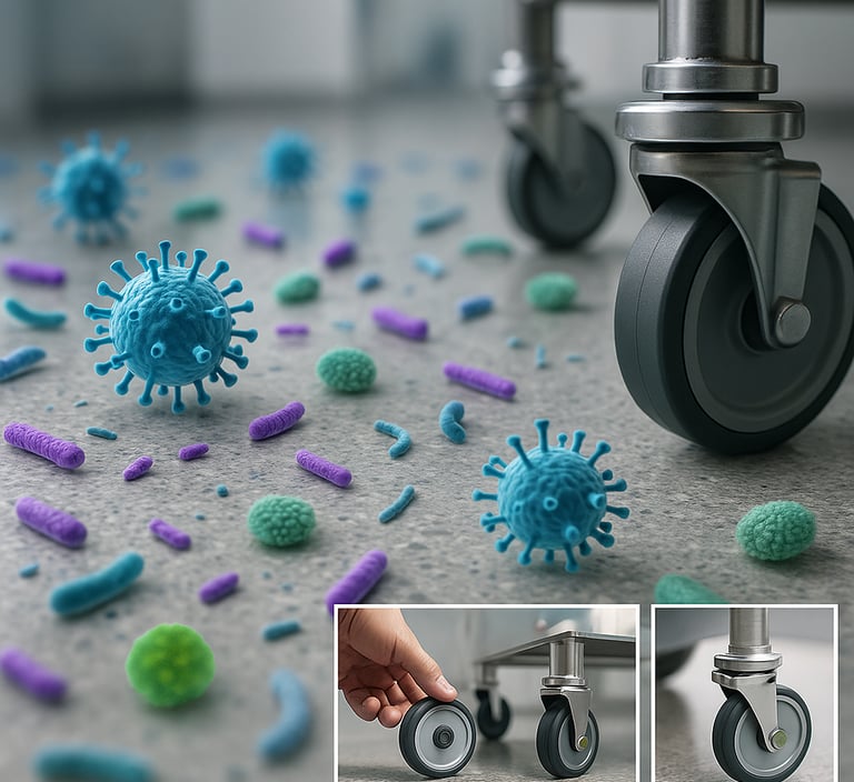 Hospital floors turn into germ highways fast. Within 24 hours many rooms harbor MRSA, C. difficile and, in veterinary settings, Salmonella, Campylobacter, E. coli, MRSP, Pseudomonas, even ringworm (Microsporum canis) They all ready to hitch a ride on wheels. Those microbes don’t stay put: they transfer to shoes, linens, high-touch items, and crucially the wheels on beds, carts, and equipment. Every roll can spread contamination from room to room, quietly undermining infection control.*